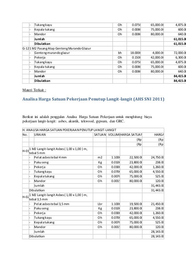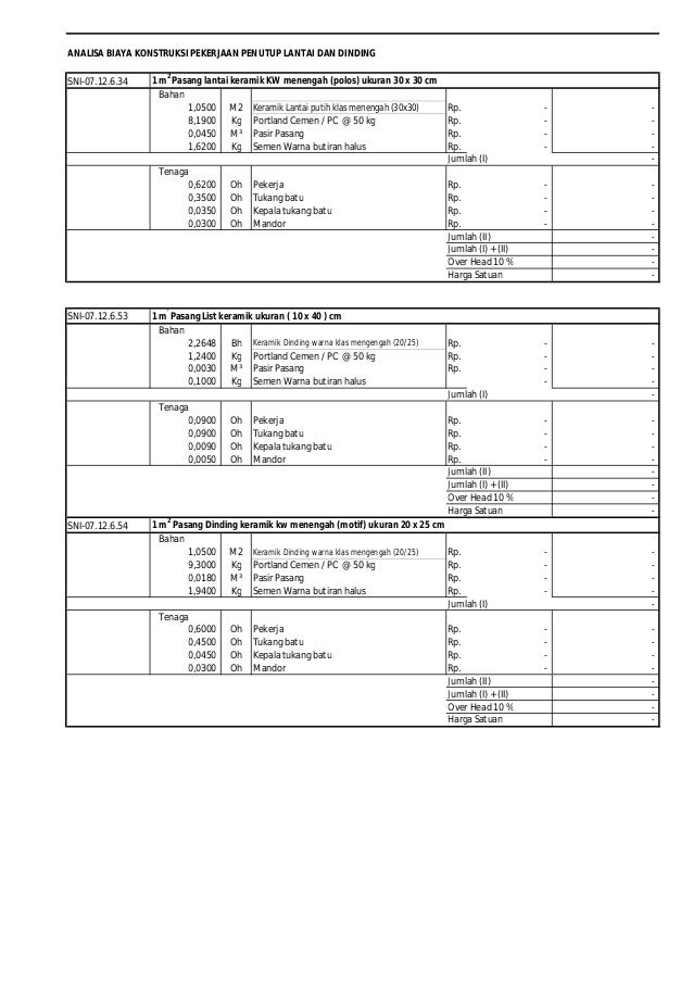 Analisa Harga Satuan Pekerjaan Penutup Lantai dan Dinding AHS SNI 2011 Berikut yaitu analisa harga satuan pekerjaan epilog landat dan dinding lakukan menghitung biaaya epilog lantai per meter persegi seperti lantai keramik lantai marmer dll